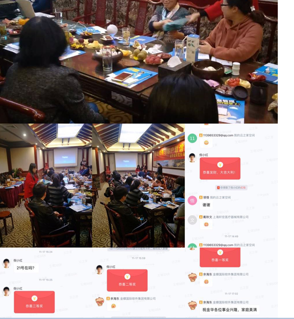 兩點四十,小伙伴們都到的差不多啦,金辰軟件的副總經(jīng)理倪小紅開場給大家做了活動說明,強調活動的意義,同時感謝客戶的積極參與,接下來由金蝶國際軟件集團有限公司溫州金華的云之家分銷管理經(jīng)理周泠周老師介紹了一下云之家,還有金蝶國際軟件集團有限公司溫州金華片區(qū)的總監(jiān)余海東余老師介紹了云之家基于kis產(chǎn)品的請應用,最后由金辰kis事業(yè)部的徐春蓮介紹了KIS云專業(yè)版15.0的新增功能。在此期間穿插了有獎問答和抽獎的環(huán)節(jié)。